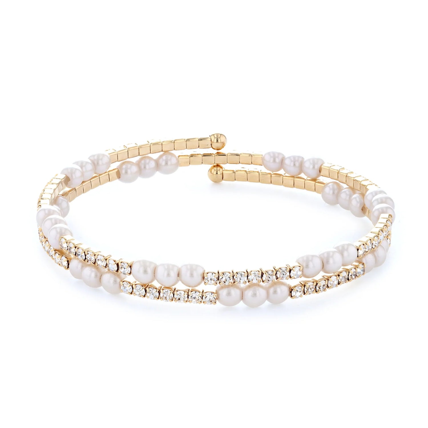 Indulge in luxury with our 14kt Gold Rhodium Plated Flex Bangle. This stunning piece features two rows of simulated pearls and sparkling crystal stones, set in a rhodium plated brass metal for a sleek yellow gold finish. Elevate any outfit with this elegant and exclusive bangle.