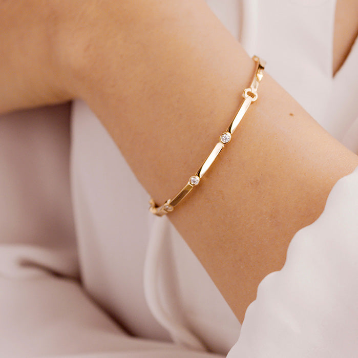 The Copley Multi Stone Bangle is delicate and fun, but boasts a big sparkle . The diamonds are delicately placed throughout the bangle, and this thinner design is a classic style to bring you from day to night. This bracelet can be worn alone or stacked with others for a bold effect.