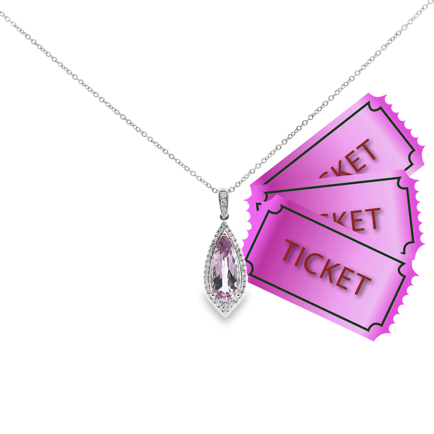 Each ticket is your chance to win this breathtaking 14K white gold pendant, featuring a 2.5 carat pear-shaped amethyst surrounded by a .24 carat total weight diamond halo, complete with chain — a $2,200 value.