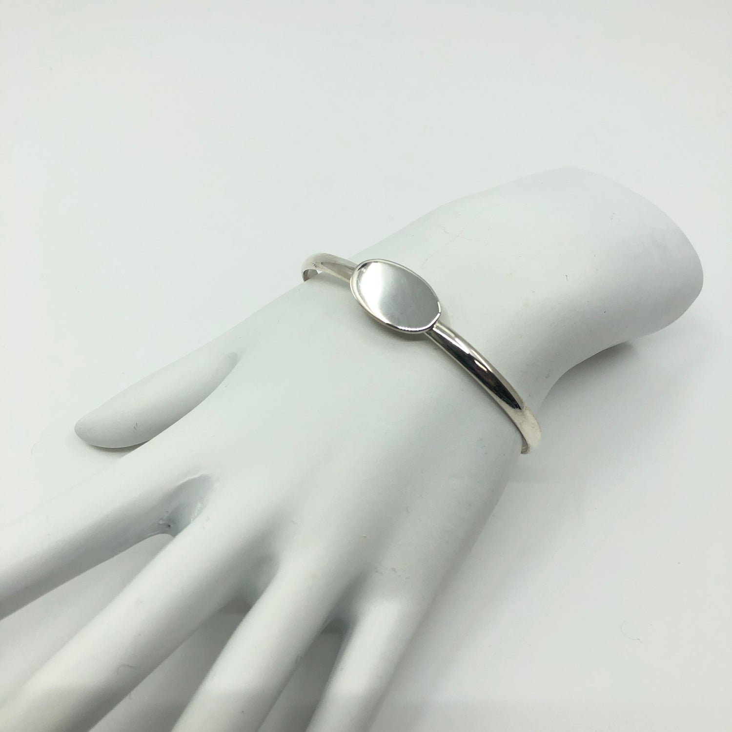 This Sterling Silver bracelet features an oval disc on the top that is perfect for engraving, or just as a plain accent on its own.