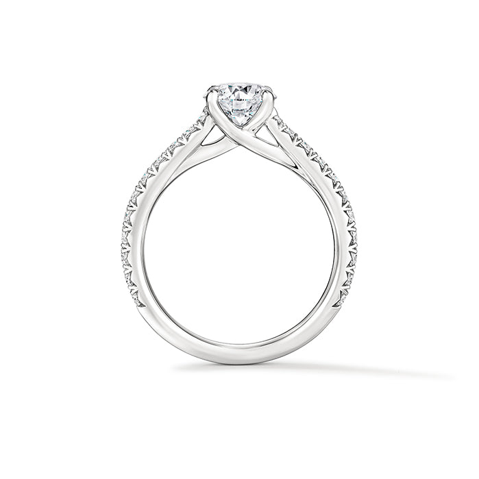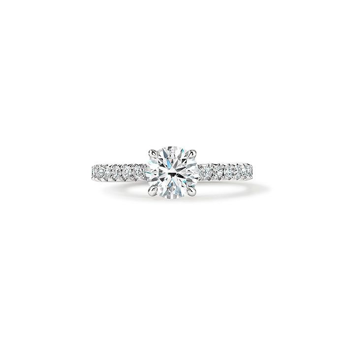 Shine bright in the Vela Solitaire Ring with a diamond band. The perfect blend of simplicity and elegance, the center stone is complemented by an encrusted diamond band, made out of platinum, to create maximum sparkle.