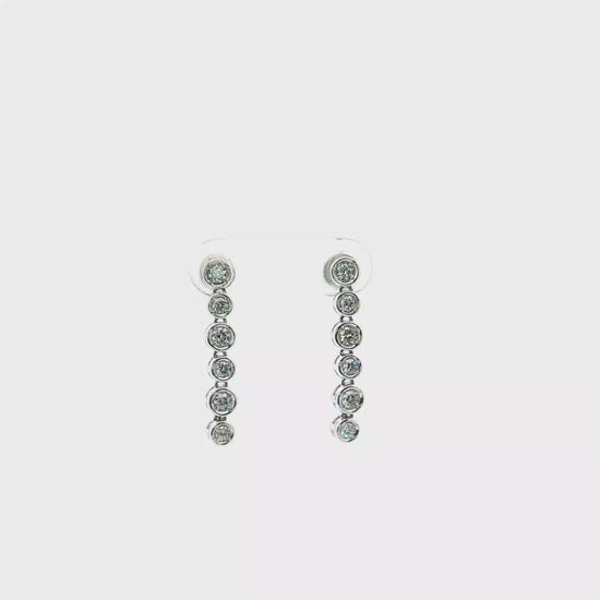 Elevate your style with these exquisite dangle earrings, crafted from lustrous 14K white gold. Each earring showcases a meticulously arranged row of round cut diamonds, exhibiting exceptional brilliance and fire. Total diamond carat equaling .50cts. The classic design and sparkling diamonds make these earrings a perfect accessory for both formal occasions and everyday elegance.